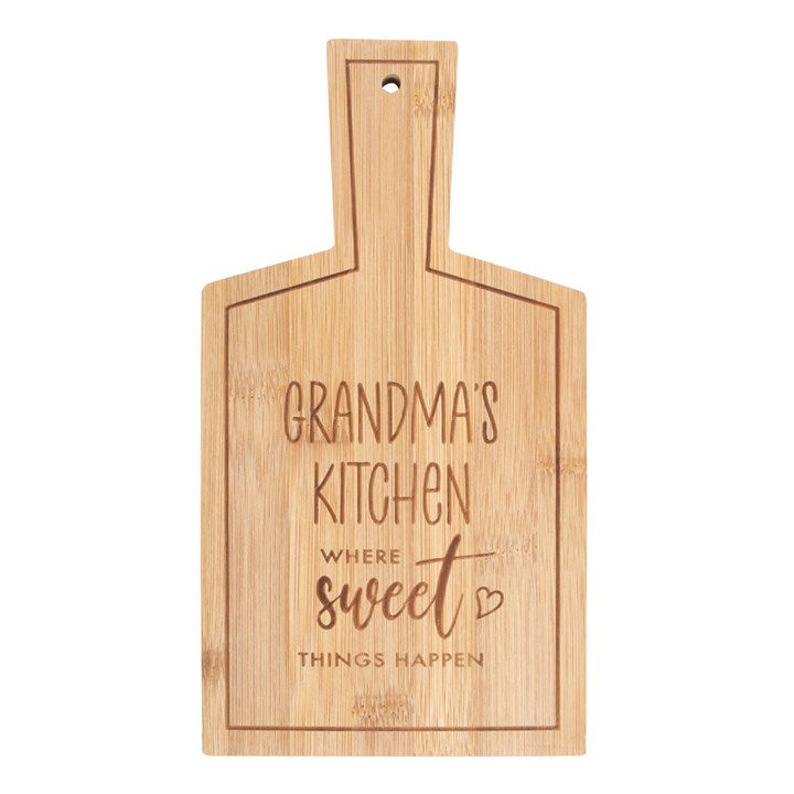 Durable and eco-friendly, this 100% bamboo serving board is a must-have in any Grandma's house. Featuring the wording 'Grandma's Kitchen, Where Sweet Things Happen' it's perfect for serving up freshly baked cakes or the tastiest biscuits which are always in supply at Grandma's. Food safe. Hand wash only. Do not soak. Product Dimensions: H26.5cm x W14cm x D1.35cm Packaged Dimensions: H26.5cm x W14cm x D1.35