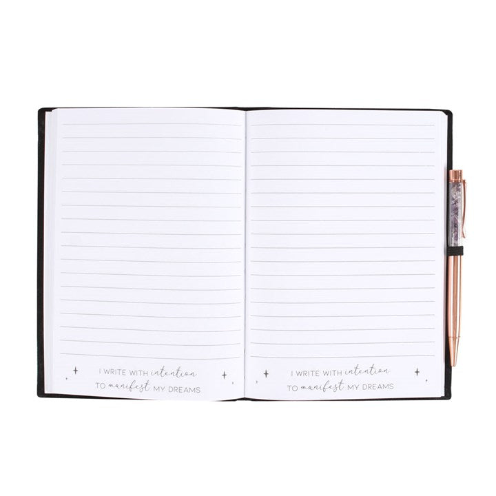 This manifestation journal comes bound in black velvet and makes the perfect place to keep track of hopes, dream and intentions. Features lined pages with 'I write with intention to manifest my dreams' text and comes with an elegant amethyst crystal chip ballpoint pen. A5. Product Dimensions: H21cm x W15.5cm x D1.7cm Packaged Dimensions: H21cm x W15.5cm x D1.7cm 100 sheets / 200 lined pages.
