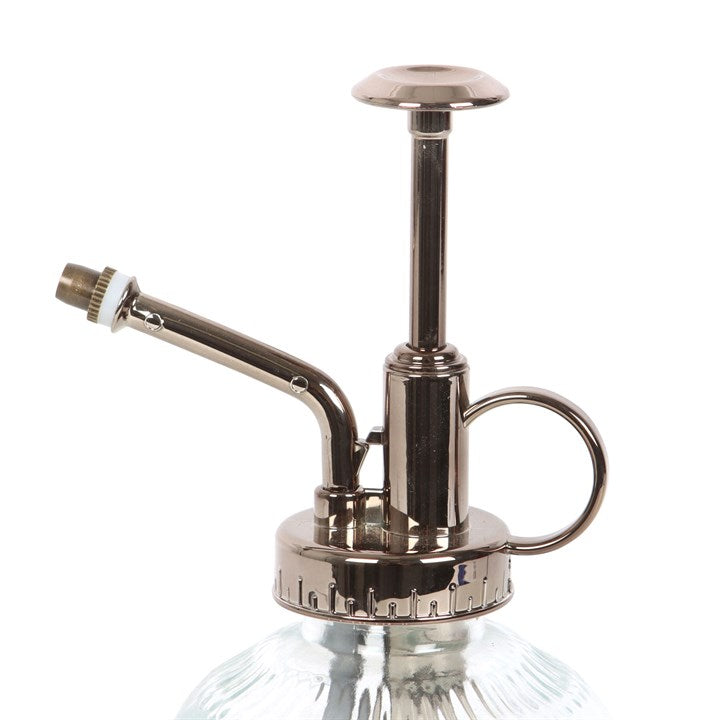 This simple glass plant mister has a lovely vintage feel and is the perfect gift for any indoor garden enthusiast. The clear glass features a decorative patterned design and is finished with a dark metal pump spray and thumb holder. Simply fill with water and use whenever plants need a delicate misting. 16cm in height.